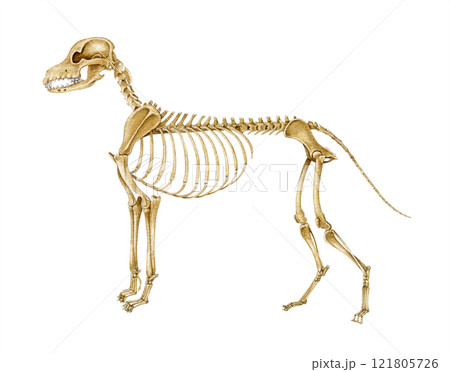 Dog skeleton hand drawn realistic detailed illustration. Canine bones on white background. Dog skeleton inner anatomy structure for study, print, veterinary, zoology projects