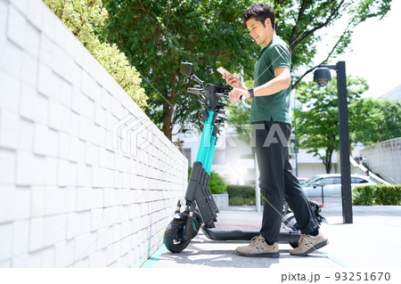 電動キックボードのポートにてスマホの画面を見る若い男性