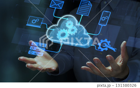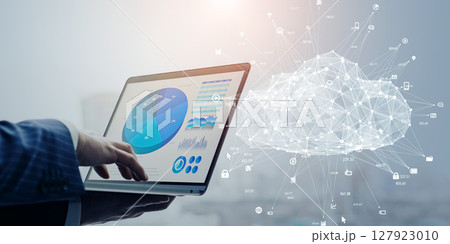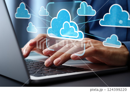ノートパソコンを使う男性とクラウドコンピューティングのコンセプト