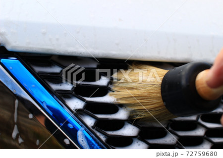 ディテイリングブラシによるフロントグリルの細部洗浄