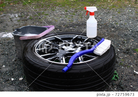 汚れたタイヤに洗浄剤をスプレーで吹きかける