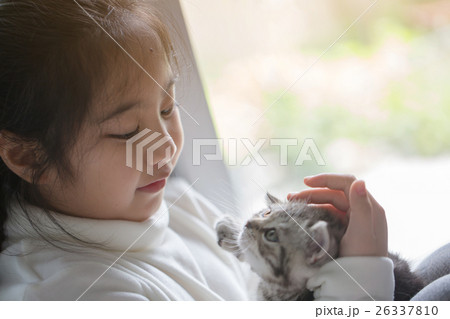 Adorable little Asian girl holding her Scottish fold kitten on t