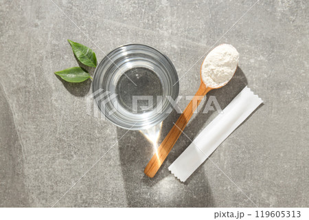 Collagen powder in a wooden spoon with a glass of water