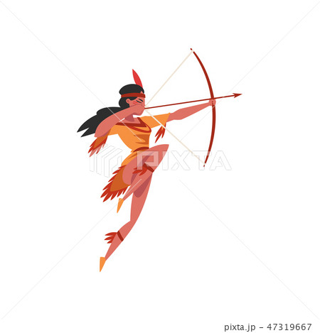 Native American Indian girl shooting a bow, young woman in traditional ethnic clothes and headband
