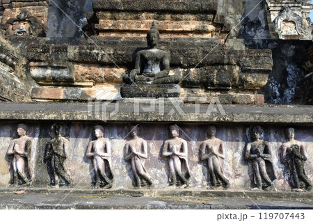 タイ北部の古都スコータイ 世界文化遺産スコータイ歴史公園のワットプラパーイルアン遺跡の仏塔や仏像