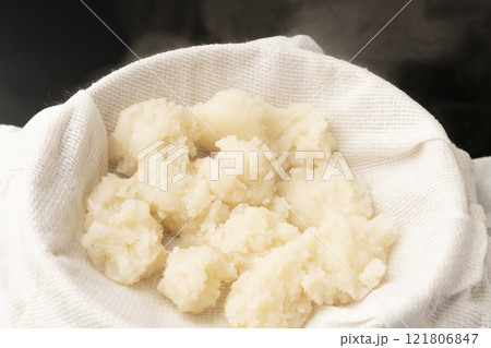 上新粉で団子を作る 上新粉に砂糖と熱湯を混ぜてこねた団子をせいろで蒸す