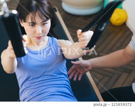 マシンピラティスのレッスンを受ける女性