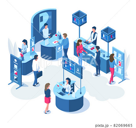 Isometric exhibition demonstration promo stands and trade stalls. Expo demonstration stand with workers and visitors vector illustration. Promo stands composition