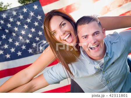 Military Couple Piggy Riding In Front of American Flag
