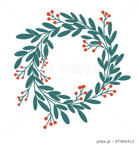 Christmas wreath. Decor for New Year Christmas and holiday. Wreath with holly berries, mistletoe, pine and fir branches, cones, rowan berries. Hand drawn illustration isolated on the white background
