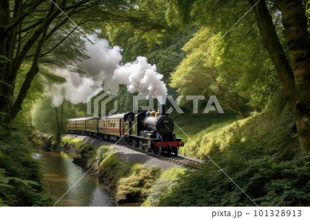 steam train chugging through woodland, with trees and streams in the background, created with generative ai