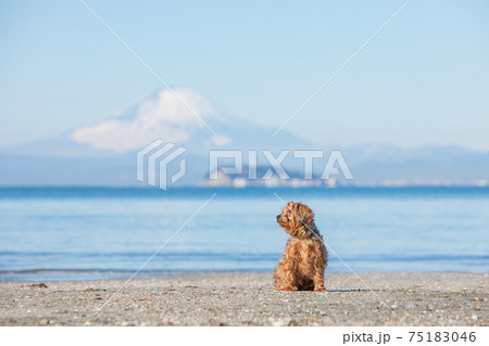 冬の江ノ島と富士山が見える海岸にたたずむMIX犬とその飼い主の女性