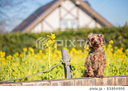 菜の花を背景におすわりをして飼い主の指示を待つヨーキーとトイプードルのハーフ犬