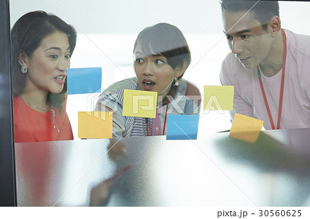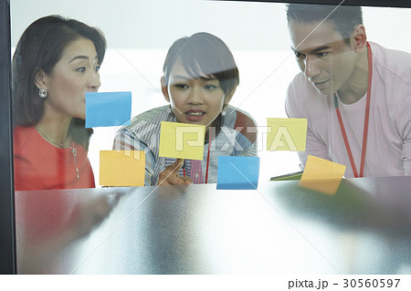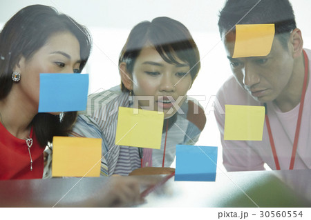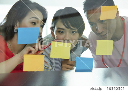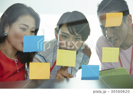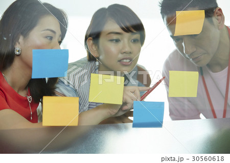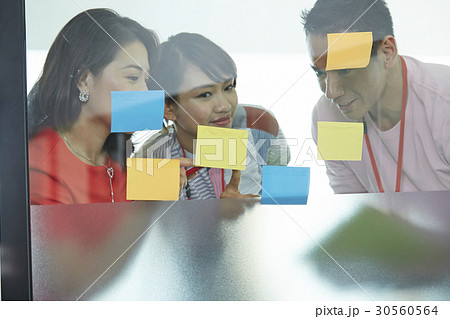 A businesswoman is pointing at sticky notes to colleagues in office.