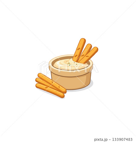 Delightful appetizer illustration featuring crispy breadsticks and a savory dip bowl for culinary
