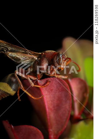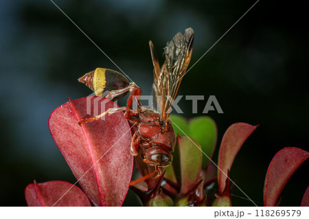 Wasp, Macro photo of a pair of insects mating on a green leaf