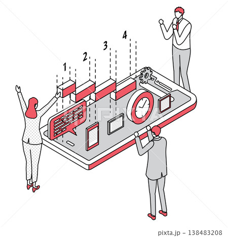 プロジェクト管理ツールを操作するビジネスチームのアイソメトリック線画イラスト