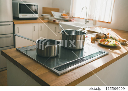 IHクッキングヒーターと鍋のあるオープンキッチンの風景