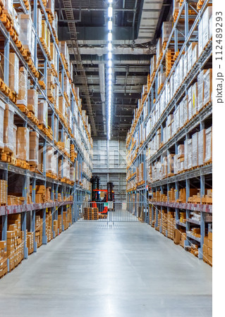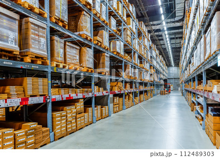 Empty storehouse delivery department with nobody in it full with rows of shelves with carton boxes, ready for workers to start preparing packages. Interior of heavy industry manufacturing factory.