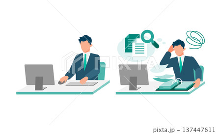 書類に押しつぶされるビジネスマンとデータ管理するビジネスマン
