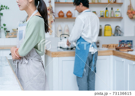 モヤモヤする関係の夫婦カップル(色付き青色/線画)