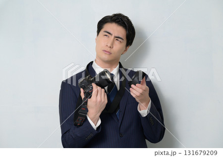カメラを持って悩むスーツの男性
