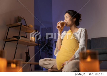 飲み物を飲んでほっとひと息する女性