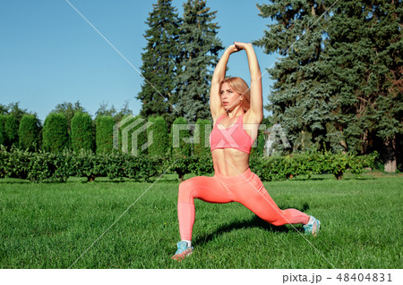 Healthy Lifestyle. Woman practicing yoga outdoors in low lunge pose concentrated