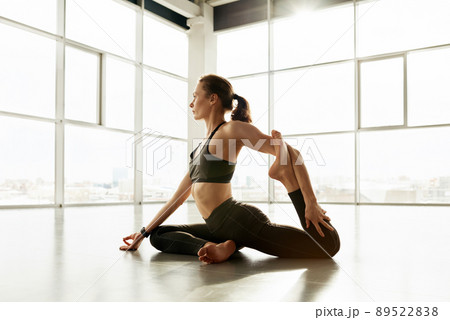 Concentrated yogi woman sitting on floor and stretching leg while doing one legged king pigeon against panoramic window