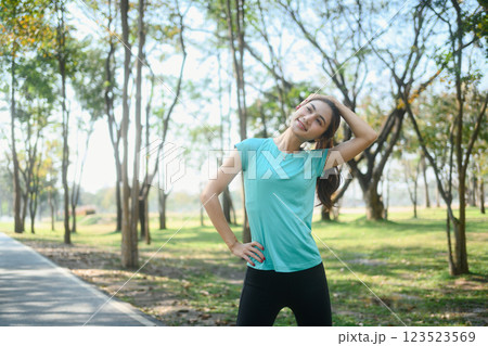 Smiling young woman in sportswear stretching her neck after run in a peaceful park