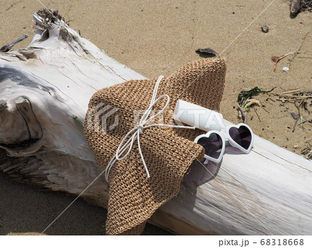 ビーチの必需品、流木の上に置かれたストローハットとサングラスと日焼け止め