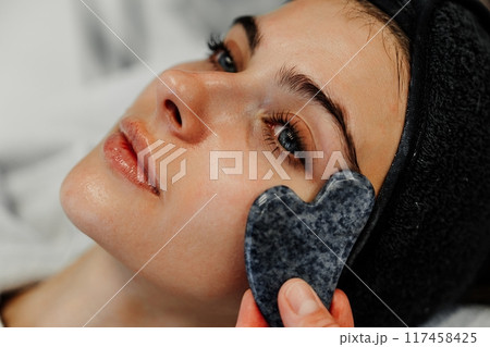 A young woman enjoys a relaxing facial treatment at a spa in the late afternoon