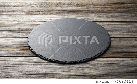 Black slate texture background, ceramic kitchen dish, restaurant menu backdrop