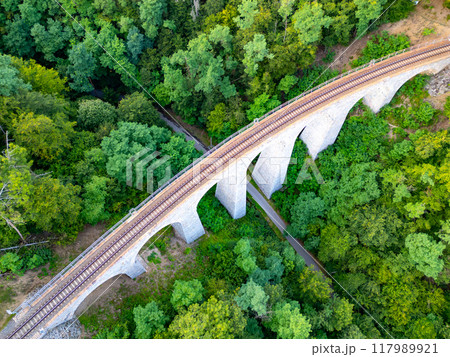 The Zampach stone railway bridge arches gracefully over lush green trees in Czechia, showcasing a blend of natural beauty and remarkable engineering.