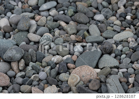 A collection of irregular stone shapes is arranged in a curved line. The stones vary in size and color, suited for creative projects or backgrounds