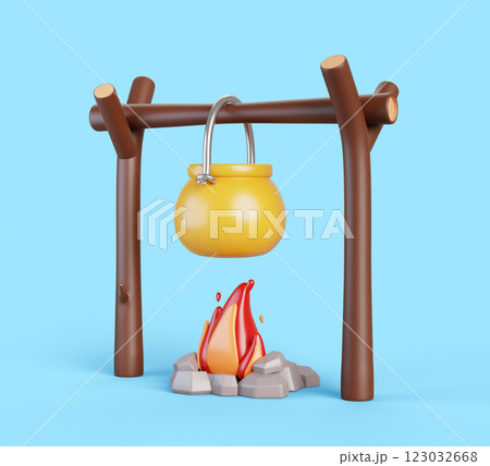 3d cauldron over campfire for outdoor cooking isolated on blue background. Bonfire lined with stone, yellow metal bowler on fire for summer camp, tourism, hiking, vacation on nature. 3D illustration