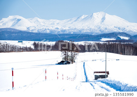 冬の北海道美瑛町周辺から見た旭岳と大雪山系の風景