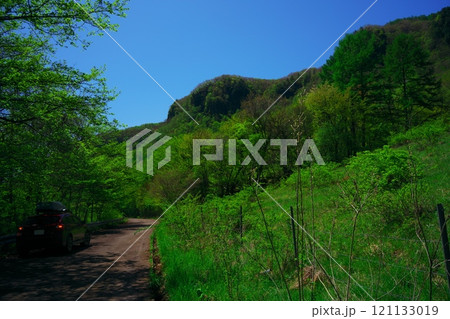 新緑の倉越パノラマラインの道路から倉越高原を仰ぎ見る
