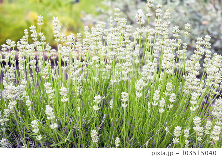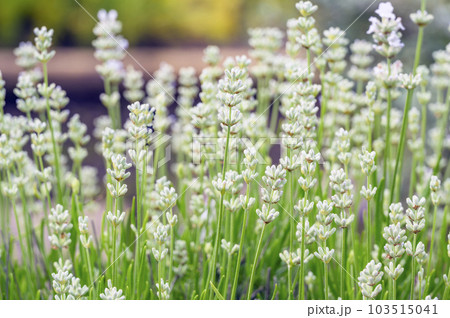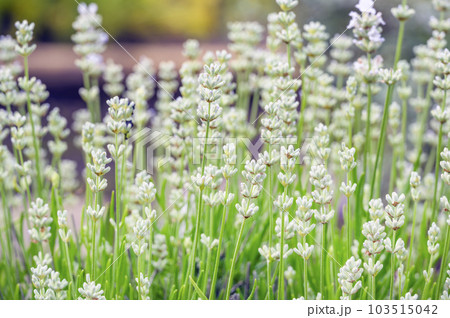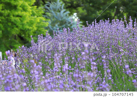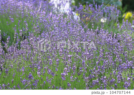 初夏の花壇に咲く鮮やかな紫色のラベンダー