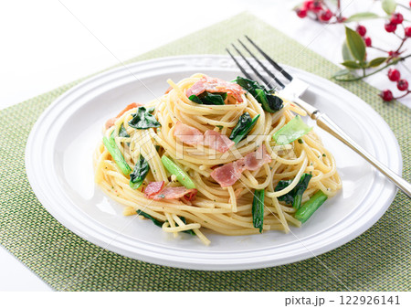 和風明太子パスタ、めんたいこスパゲッティ、しめじと水菜入り。和風出汁パスタ。