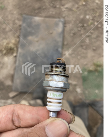 農機具の劣化したスパークプラグを手で持つ・整備写真