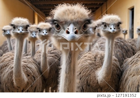Feathered Gathering: Ostrich Group Graces the Farm Yard Indoors. Generative ai