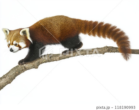 enchanting creature skillfully navigates a branch, its bushy tail trailing elegantly behind, embodying the charm and curiosity of the red panda in a serene setting.