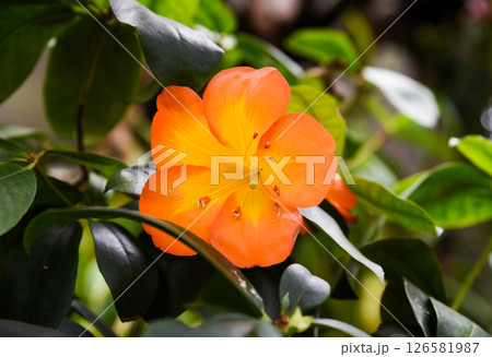 Bright orange Rhododendron zoelleri flowers in full bloom, tropical ornamental plant from the Ericaceae family, vivid and exotic appearance.