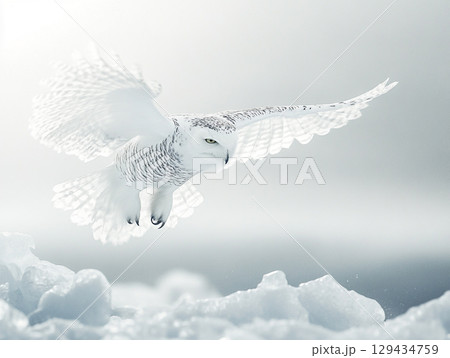 A magnificent snowy owl glides through a snowstorm, its powerful wings spread wide. Its piercing yellow eyes stare ahead.