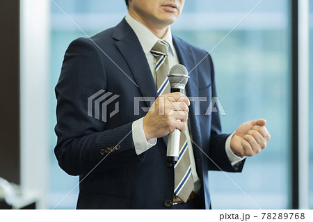マイクを持ってスピーチをする若いビジネスパーソン ビジネスイメージ