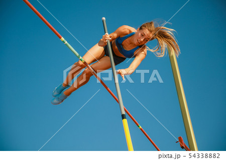 Female high jumper training at the stadium in sunny day