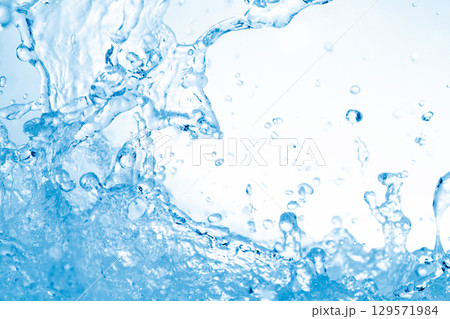 青の背景に飛び散る水飛沫.