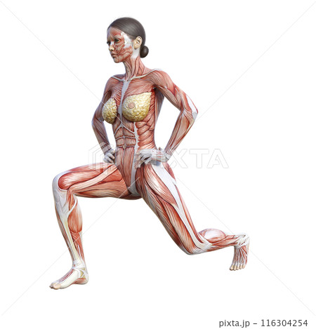 筋肉解剖図 スプリットスクワットをする人体模型女性の3Dイラスト 正面
