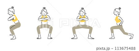 筋トレ ストレッチ スクワットをする女性のシルエット 全身正面 前向きのイラスト